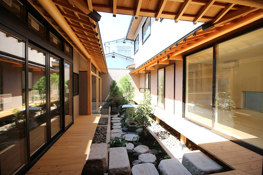 外観は水平ラインを基調としており、数寄屋造りならではの直線美をイメージ。縦にならんだ格子もインパクト大です。中庭は、すべての居室から眺めることが可能。どのような見え方になるのか、実際に足を運んでチェックしてみるとよいでしょう。また、職人がひとつひとつ手で加工した、手刻みの造形・技術力も随所に光ります。